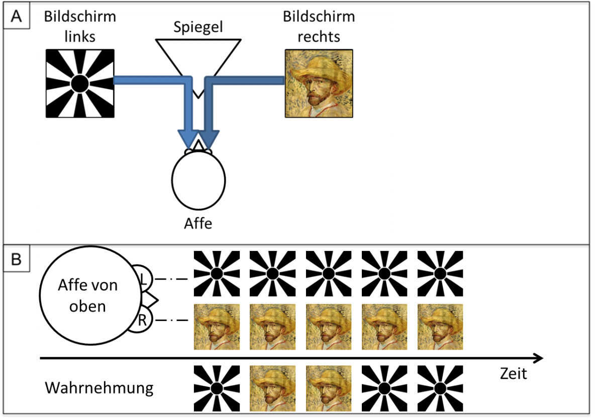 Um Antworten auf diese Fragen zu finden, untersuchte eine Gruppe von WissenschaftlerInnen in Tübingen in einer Reihe von Studien (zusammengefasst in Logothetis, 1998) die Gehirnaktivität von Affen, während diesen verschiedene visuelle Stimuli gezeigt wurden. Das Prinzip war dabei immer wie folgt: Mithilfe von speziellen Spiegeln, vor denen die Affen positioniert wurden, projizierten die WissenschaftlerInnen zwei unterschiedliche visuelle Stimuli auf beide Augen der Affen, zum Beispiel ein Sonnenscheinmuster auf das linke Auge und einen Gesichtsstimulus auf das rechte Auge oder umgekehrt (Abbildung 2). Wenn das visuelle System auf diese besondere Art stimuliert wird (WissenschaftlerInnen sprechen von „Binokularer Rivalität“), nimmt man nicht etwa zwei Gegenstände gleichzeitig bewusst wahr, auch keine Mischung der beiden. Stattdessen nimmt man zeitlich variierend immer nur einen der beiden Stimuli bewusst wahr. Zunächst zum Beispiel das Sonnenscheinmuster, dann nach einigen Sekunden das Gesicht, dann nach wieder einigen Sekunden das Sonnenscheinmuster usw. Affen können so trainiert werden, dass sie angeben können, in welchem von zwei Bewusstseinszuständen sie sich gerade befinden. Durch Elektrodenmessungen im Gehirn der Affen konnten die WissenschaftlerInnen die Aktivität von Neuronengruppen oder sogar von einzelnen Neuronen unter zwei sich jeweils abwechselnden Wahrnehmungsbedingungen bestimmen. Das Elegante an dieser Art von Versuchsanordnung ist, dass sich der Bewusstseinsinhalt mit der Zeit verändert, wohingegen der sensorische Input in beide Augen unverändert bleibt.