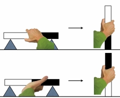 Experimentell wurde dieses Verhalten von Rosenbaum und KollegInnen (1990) untersucht (Abbildung 3). Versuchspersonen sollten einen horizontal ausgerichteten Stab mit der rechten Hand entweder auf sein linkes oder rechtes Ende stellen. Sollten die Versuchspersonen den Stab auf das rechte Ende stellen, griffen sie ihn von oben, sollten sie ihn jedoch auf das linke Ende stellen, verdrehten sie zunächst ihren Arm und griffen den Stab dann von unten. Die geplante Drehbewegung wurde also einmal durch einen Griff von oben und einmal durch einen Griff von unten vorbereitet, sodass alle Bewegungen in einer angenehmen Armstellung endeten. Diese Beobachtung wird deshalb auch als „End-
