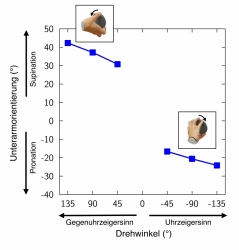 Es gibt zwar Hinweise darauf, dass das Gehirn solche komplexen Berechnungen durchführt (Johnson, 2000), neuere Forschungen sprechen aber dafür, dass es sich in vielen Fällen eines einfachen Tricks bedient. Zu dieser Annahme führten Experimente, in denen Versuchspersonen einen runden Griff greifen und drehen sollten (eine kleine Übersicht findet sich in Herbort, 2013). In manchen Experimenten war dies ein Drehregler, ähnlich dem Lautstärkeregler an einer Stereoanlage, in anderen Versuchen konnte mit dem runden Griff ein ganzes Objekt bewegt werden. Es zeigte sich, dass die Richtung der Drehbewegung einen relativ großen Einfluss auf die Greifbewegung hat. Die Weite der Drehbewegung hat dagegen nur einen kleineren Einfluss (Abbildung 5). Sie können diesen Effekt selbst leicht beobachten. Bitten Sie jemanden, einen Lautstärkeregler (oder Ähnliches) nur um wenige Grad im oder gegen den Uhrzeigersinn zu drehen. Wahrscheinlich wird die Person den Regler trotzdem auf sehr unterschiedliche Arten greifen. Und wahrscheinlich ändert sich die Greifbewegung kaum, wenn sie den Regler etwas weiter drehen soll.