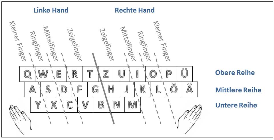 Gedächtnis für die Tastenlokalisation herausgebildet hat. Zudem verwenden ExpertInnen im Unterschied zu NovizInnen alle zehn Finger zum Tippen, wobei es eine feste Zuordnung von Fingern zu spezifischen Tasten gibt. So wird etwa die Taste [F] immer mit dem Zeigefinger der linken Hand betätigt (siehe Abbildung 1). Insgesamt betrachtet verbessert sich also durch erworbene