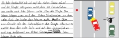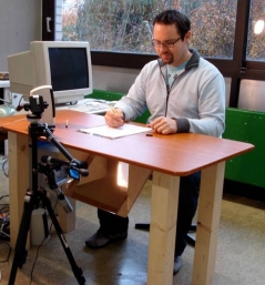Während es sich beim Tippen um diskrete, also klar voneinander abgrenzbare Ereignisse handelt, ist der handschriftliche Verlauf kontinuierlich und damit schwieriger zu handhaben. Wenn man auf einem Graphiktablett schreibt, lässt sich die Bewegungsspur als Sequenz von Stiftpositionen speichern. Hierbei gelingt es aber nur begrenzt, die handschriftliche Schreibspur, wie bei der Texterkennung, automatisch in Buchstabeneinheiten zu zerlegen. Vor allem motoriknahe Aspekte des Schreibens, beispielsweise der Schreibdruck und die Schreibflüssigkeit, lassen sich aber sehr gut untersuchen. Für jüngere Schulkinder beispielsweise könnte aber die laborartige Schreibsituation auf einem Graphiktablett schon etwas befremdlich sein. Handschriftliche Textproduktion in ihrer natürlichen Umgebung kann man natürlich, wie jedes andere Verhalten auch, videographieren und anschließend wie filmische Beobachtungssequenzen behandeln. Allerdings kann man die Entwicklung des handschriftlichen Textes von oben oder von vorne nicht ungehindert verfolgen; insbesondere linkshändische Personen verdecken das Blatt häufig mit der Schreibhand. Grabowski, Weinzierl und Schmitt (2010) haben deshalb für die Forschung in Schulen einen speziellen Schreib-Tisch entwickelt, der die gewohnte Schreibsituation mit den Anforderungen laborexperimenteller Kontrolle verbindet. Von oben gesehen entspricht der Tisch in Höhe und Größe einer ganz normalen Schulbank. Aber unter dem Blatt, das die Schülerinnen und Schüler beschreiben, befindet sich eine Plexiglasscheibe sowie darunter ein um 45 Grad gekippter Spiegel, auf den eine unter dem Tisch montierte Kamera gerichtet ist. Die gespiegelte Rückseite des beschriebenen Blattes ergibt wieder das positive Bild der Schreibspur, die man nun völlig unverdeckt in ihrer Entstehung und in ihrem Zeitverlauf videographieren und anschließend analysieren kann (s. Abb. 3).