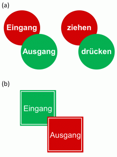 Beispiele für solche Regelmäßigkeiten finden sich natürlich auch außerhalb des Straßenverkehrs. In unserem Alltag begegnen uns häufig Aufkleber auf Türen mit der Inschrift „ziehen“ / „Eingang“ oder „drücken“ / „Ausgang“, die uns dazu anleiten sollen, die richtige Reaktion auszuführen. Typischerweise sind diese Inschriften auf bestimmten Hintergrundfarben gedruckt („Eingang“ und „ziehen“ sind oft rot hinterlegt; „Ausgang“ und „drücken“ dagegen sind grün hinterlegt, siehe Abb. 4a). Die Hintergrundfarbe des Aufklebers wird dann ebenfalls mit der instruierten Reaktion assoziiert, was eine Aktivierung der geforderten Reaktion zusätzlich befördert. An dieser Stelle ist jedoch zu sagen, dass irrelevante Reize unzuverlässige Hinweisreize für korrektes Verhalten sind. Entsprechend konnte gezeigt werden, dass der durch irrelevante Reize ausgelöste automatische