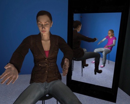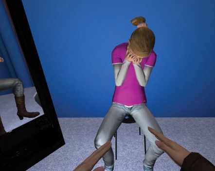 Depression. Kann VR auch diesen Menschen helfen? Eine Studie am University College London ging dieser Frage nach: Gesunde, besonders selbstkritische Frauen wurden auf raffinierte Weise in einen Körper in der virtuellen Welt versetzt (Falconer et al., 2014). Vor ihnen saß ein weinendes virtuelles Kind (siehe Bild), das die Probandinnen trösten sollten. Hatten sie diese Aufgabe erfüllt, schlüpften sie in den Körper des Kindes. Nach dem Wechsel in die Perspektive des Kindes empfingen sie ihren eigenen Trost: Sie wurden von der anderen Person so getröstet, wie sie selbst zuvor das Kind getröstet hatten. Die Ergebnisse sind ermutigend: Die Frauen fühlten sich nach dem virtuellen Erlebnis sicherer und berichteten mehr Mitgefühl für sich selbst. Und auch Depressiven scheint das Verfahren zu helfen (Falconer et al., 2016): In einer Folgestudie schlüpften depressive Personen zunächst in die Rolle der bzw. des Tröstenden, dann in die Rolle des getrösteten Kindes; insgesamt dreimal, jeweils im Abstand von einer Woche. Diese drei virtuellen Erlebnisse verringerten bei der Mehrheit die depressiven Symptome – und das sogar mit Langzeitwirkung: Noch vier Wochen später berichteten die Betroffenen, weniger selbstkritisch und dafür mitfühlender sich selbst gegenüber zu sein. Die Ergebnisse sind vielversprechend, die
