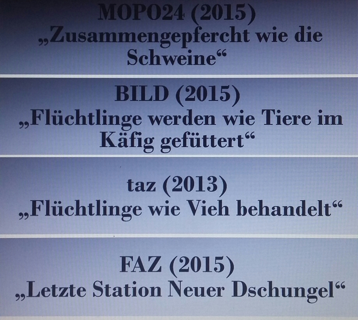 Ein Foto zeigt mehrere Personen – Männer, Frauen und Kinder –, die beengt in einem Transporter sitzen und ihre Gesichter von der Kamera abwenden. Unter der Überschrift „Zusammengepfercht wie die Schweine“ berichtet der dazugehörige Artikel auf dem Online-Portal der Hamburger Morgenpost MOPO24 (2015) über einen von der Polizei angehaltenen Transporter, in dem mehr als 20 syrische Geflüchtete von Schleusern nach Deutschland gebracht wurden. Die BILD (2015) beschreibt unter der Überschrift „Flüchtlinge werden wie Tiere im Käfig gefüttert“ die Zustände in ungarischen Unterkünften für Geflüchtete. Aber nicht nur Boulevardmedien verwenden Tier-Vergleiche, wenn es um Berichte über Geflüchtete geht: Auch in der taz („Flüchtlinge wie Vieh behandelt“, Braun, 2013), der FAZ („Letzte Station Neuer Dschungel“, Wiegel, 2015) und einer Reihe weiterer Qualitätszeitungen finden sich ähnliche Überschriften (siehe Abbildung 1). Ein Ziel dieser Medienbeiträge ist es vermutlich, auf die extrem belastenden Bedingungen während der Flucht
