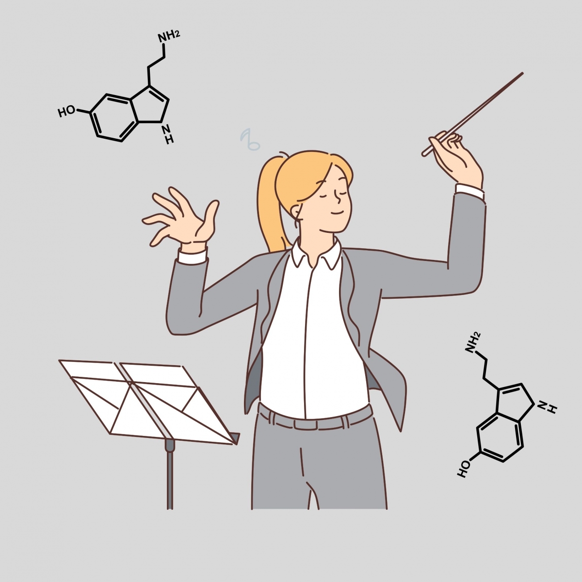Serotonin ist wie die Dirigentin eines Orchesters, während kognitive Funktionen die Instrumente sind. Serotonin sorgt dafür, dass die kognitiven Funktionen, die uns ermöglichen, die Welt wahrzunehmen, zu verstehen und mit ihr zu interagieren, harmonisch zusammenspielen. Es beeinflusst fast alle Aspekte unseres Lebens – von der Regulierung der Stimmung bis hin zur Steuerung des Schlafes und des Appetits (Boureau & Dayan, 2011).